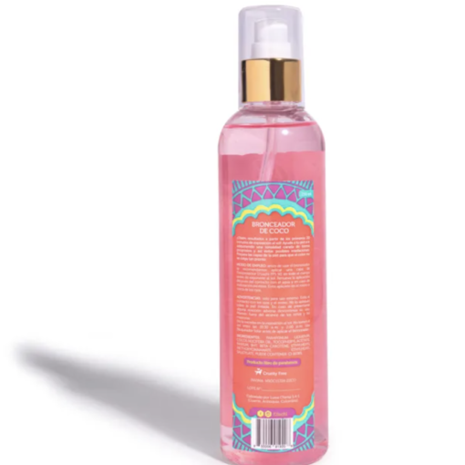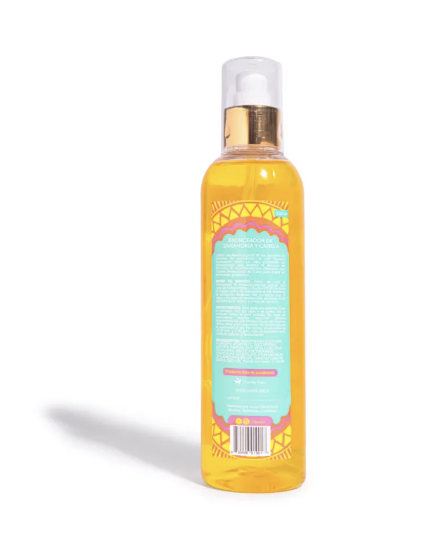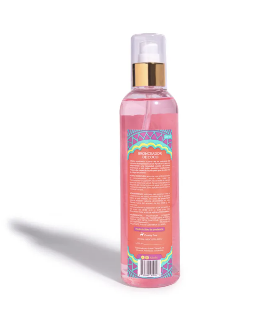 ADVERTENCIAS: Sólo para uso externo. Evita el contacto con los ojos y el rostro. No lo apliques sobre la piel irritada. En caso de presentarse alguna reacción adversa descontinúa su uso. Mantén fuera del alcance de los niños y las mascotas. No te excedas en la exposición al sol. No tomes el sol entre las 10:30 a.m. y 2:00 p.m. Usa bloqueador solar antes de aplicar el bronceador.
