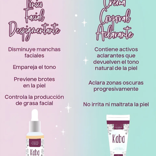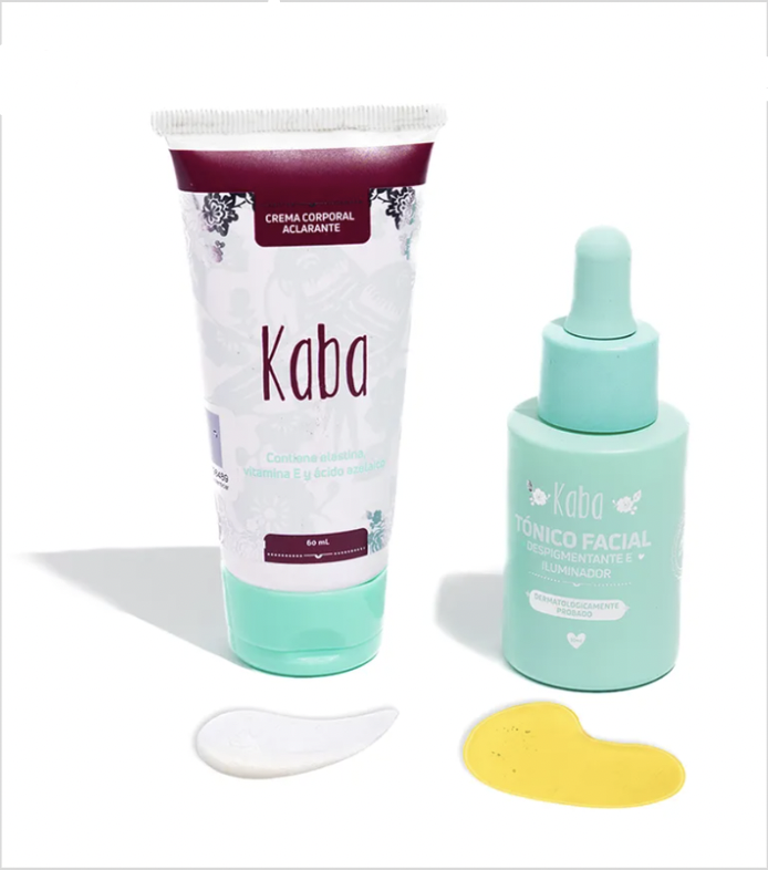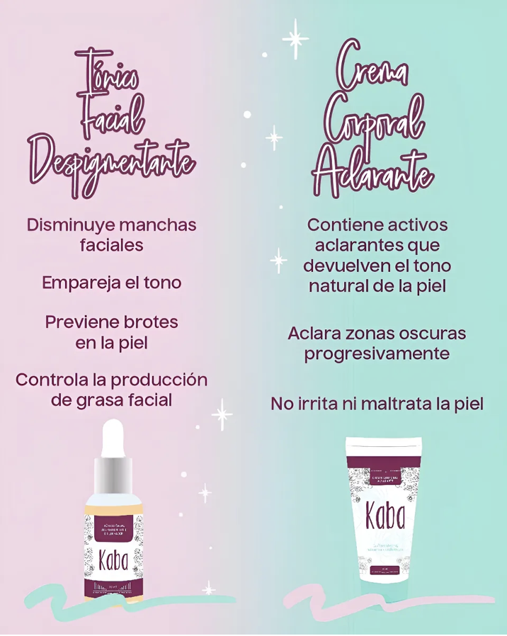 Kit Adios manchas ( 2 Productos) elaborado por Kaba. Este kit es ideal para cuidado corporal y facial, diseñado para reducir todo tipo de manchas faciales y aclarar progresivamente el tono de las zonas oscuras de tu piel. Incluye un Tónico Facial y una Crema Aclarante.