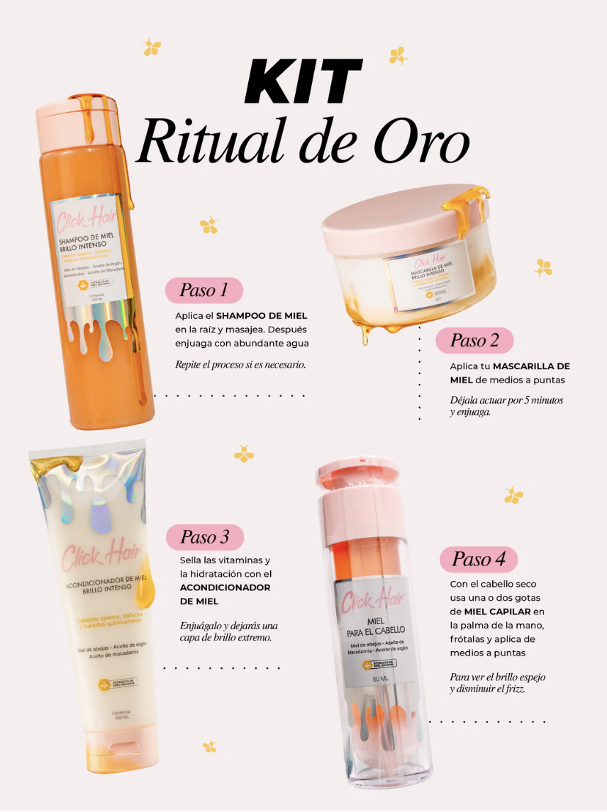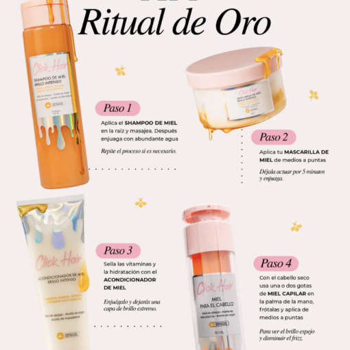 Ritual de oro con los beneficios de la miel natural de abejas, capaz de restaurar un cabello dañado, seco o tratado químicamente. Este trío combina la limpieza suave y cuidadosa del Shampoo, la restauración intensa y nutrición profunda del acondicionador y la Mascarilla, con el toque final de ultra brillo y sellado de puntas de la Miel para el Cabello. Este ritual de oro será el rescate de tu cabello dañado.