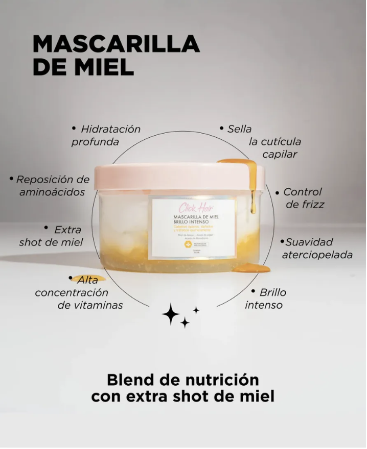 Tratamiento con shot de miel de abejas natural que repone los aminoácidos y proteínas perdidas para sellar las cutículas, dar hidratación profunda y reparar la fibra de los cabellos maltratados, secos y opacos, proporcionándoles una suavidad aterciopelada y un brillo deslumbrante. Perfecto para recuperar la vitalidad y realzar el color después de tratamientos químicos, dejando tu cabello completamente renovado, sano y lleno de brillo.